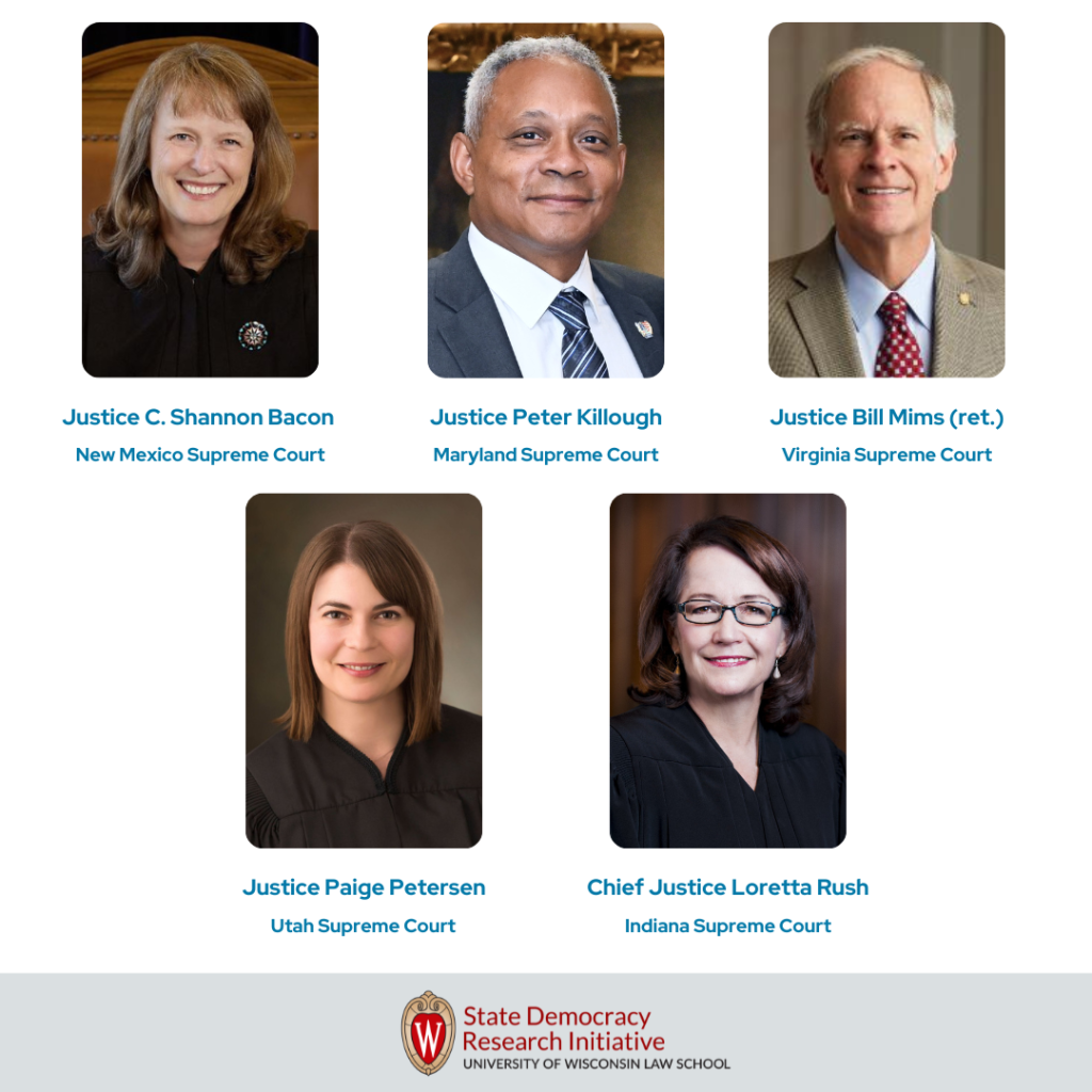 The State Democracy Research Initiative is delighted to welcome Justice C. Shannon Bacon (New Mexico Supreme Court), Justice Peter Killough (Maryland Supreme Court), Justice Bill Mims (Ret.) (Virginia Supreme Court), Justice Paige Petersen (Utah Supreme Court), and Chief Justice Loretta Rush (Indiana Supreme Court). The panel will be moderated by State Democracy Research Initiative Co-Director Professor Rob Yablon.