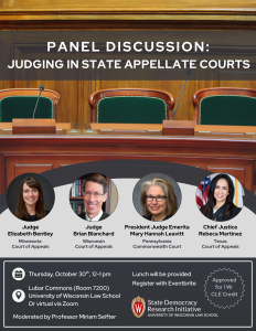 On October 30th, 2025, the State Democracy Research Initiative hosted a panel discussion: “Judging in State Appellate Courts.” This panel highlighted the important and often overlooked role of state intermediate appellate court judges in our legal system. The discussion included topics such as the application and development of precedent in intermediate courts; the courts’ caseload, dockets, and decision-making practices; and how intermediate courts interact with state supreme courts and trial courts.